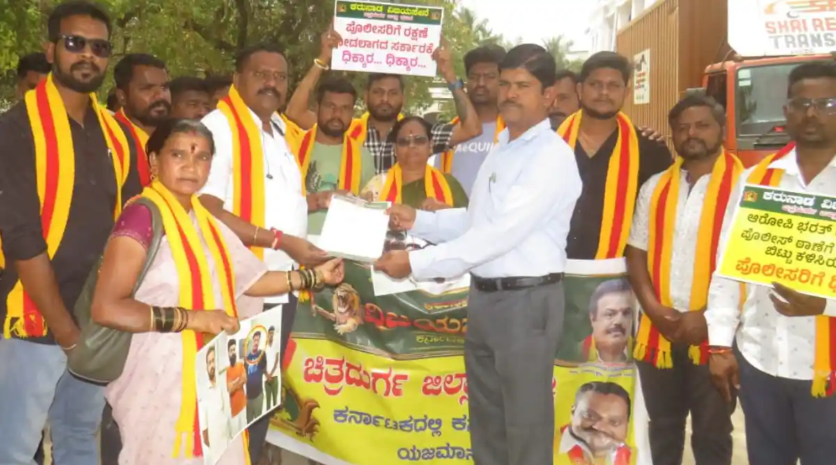ಸುದ್ದಿಒನ್, ಚಿತ್ರದುರ್ಗ, ಮಾರ್ಚ್. 05 : ಪೊಲೀಸರ ಮೇಲೆ ಹಲ್ಲೆ ನಡೆಸಿರುವವರನ್ನು ಗೂಂಡಾ ಕಾಯಿದೆಯಡಿ ಬಂಧಿಸಿ ಕಾನೂನು ರೀತಿಯ ಕ್ರಮ ಕೈಗೊಳ್ಳುವಂತೆ ಕರುನಾಡ ವಿಜಯಸೇನೆಯಿಂದ ಜಿಲ್ಲಾಧಿಕಾರಿ ಕಚೇರಿ ಎದುರು ಬುಧವಾರ ಪ್ರತಿಭಟನೆ ನಡೆಸಿ ಉಪ ವಿಭಾಗಾಧಿಕಾರಿಗೆ ಮನವಿ ಸಲ್ಲಿಸಲಾಯಿತು.