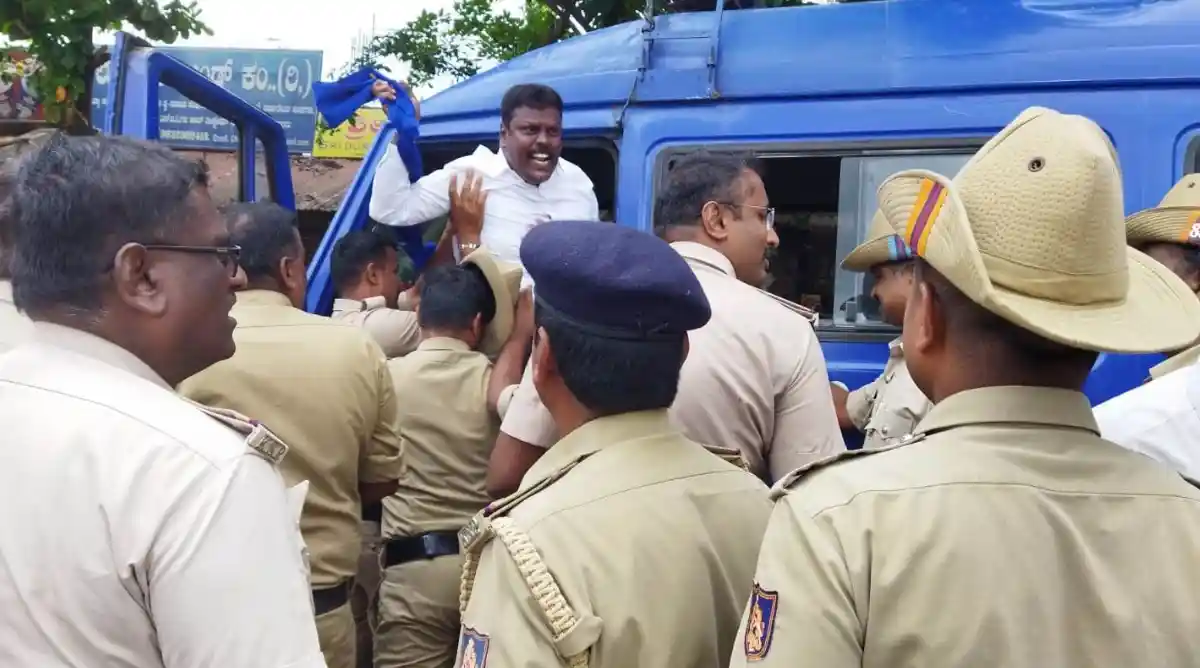ರಾಜಿನಾಮೆ ನೀಡಬೇಕೆಂದು ಕಾಂಗ್ರೆಸ್ ಕಚೇರಿಗೆ ಒಂಟಿಯಾಗಿ ನುಗ್ಗಲೆತ್ನಿಸಿದ ತಿಪ್ಪೇಸ್ವಾಮಿ ಛಲವಾದಿಯನ್ನು ಹತ್ತಕ್ಕೂ ಹೆಚ್ಚು ಮಂದಿ ಪೊಲೀಸರು ಸುತ್ತುವರೆದು ಬಂಧಿಸಿದರು.