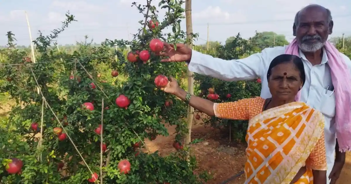 ಮಹಾರಾಷ್ಟ್ರದ ಜಲಗಾವ್ ಜೈನ್ ಕಂಪನಿಯ ಕೆಆರ್ಎಸ್ ಭಗವ ತಳಿಯ ಗಿಡಗಳನ್ನು 45 ರೂ.ಗಳಿಗೆ ಒಂದರಂತೆ 2050 ಗಿಡಗಳನ್ನು ಖರೀಧಿಸಿ ಏಳು ಎಕರೆ ಜಮೀನಿನಲ್ಲಿ ನೆಟ್ಟಿರುವ ಈ ದಂಪತಿಗಳು ಎರಡು ವರ್ಷಗಳಿಂದಲೂ ಕಣ್ಣಲ್ಲಿ ಕಣ್ಣಿಟ್ಟು ಕಾವಲು ಕಾಯುತ್ತಿರುವುದರಿಂದ ದಾಳಿಂಬೆ ಹಣ್ಣುಗಳು ಈಗ ಕೈಗೆ ಬಂದಿದ್ದು, ಒಂದು ಗಿಡದಲ್ಲಿ 60 ಕ್ಕೂ ಅಧಿಕ ಹಣ್ಣುಗಳು ಬಿಟ್ಟಿವೆ. ಒಂದೊಂದು ಹಣ್ಣು ಅರ್ಧ ಕೆ.ಜಿ. ಯಷ್ಟಿದ್ದು, ಭಾರಕ್ಕೆ ನೆಲಕ್ಕೆ ತೂಗುತ್ತಿವೆ. ಗಿಳಿ, ಗುಬ್ಬಚ್ಚಿ, ಅಳಿಲುಗಳ ಕಾಟದಿಂದ ಹಣ್ಣುಗಳನ್ನು ರಕ್ಷಿಸಿಕೊಳ್ಳಲು ಬಲೆ ಹೆಣೆಯಲಾಗಿದೆ. ರಾತ್ರಿ ವೇಳೆ ಹಣ್ಣುಗಳನ್ನು ಕದಿಯಲು ಬರುವವರ ಮೇಲೆ ನಿಗಾ ಇಡಲು ಸೈರನ್ ಕ್ಯಾಮರಾ ಕೂಡ ಅಳವಡಿಸಲಾಗಿದೆ.