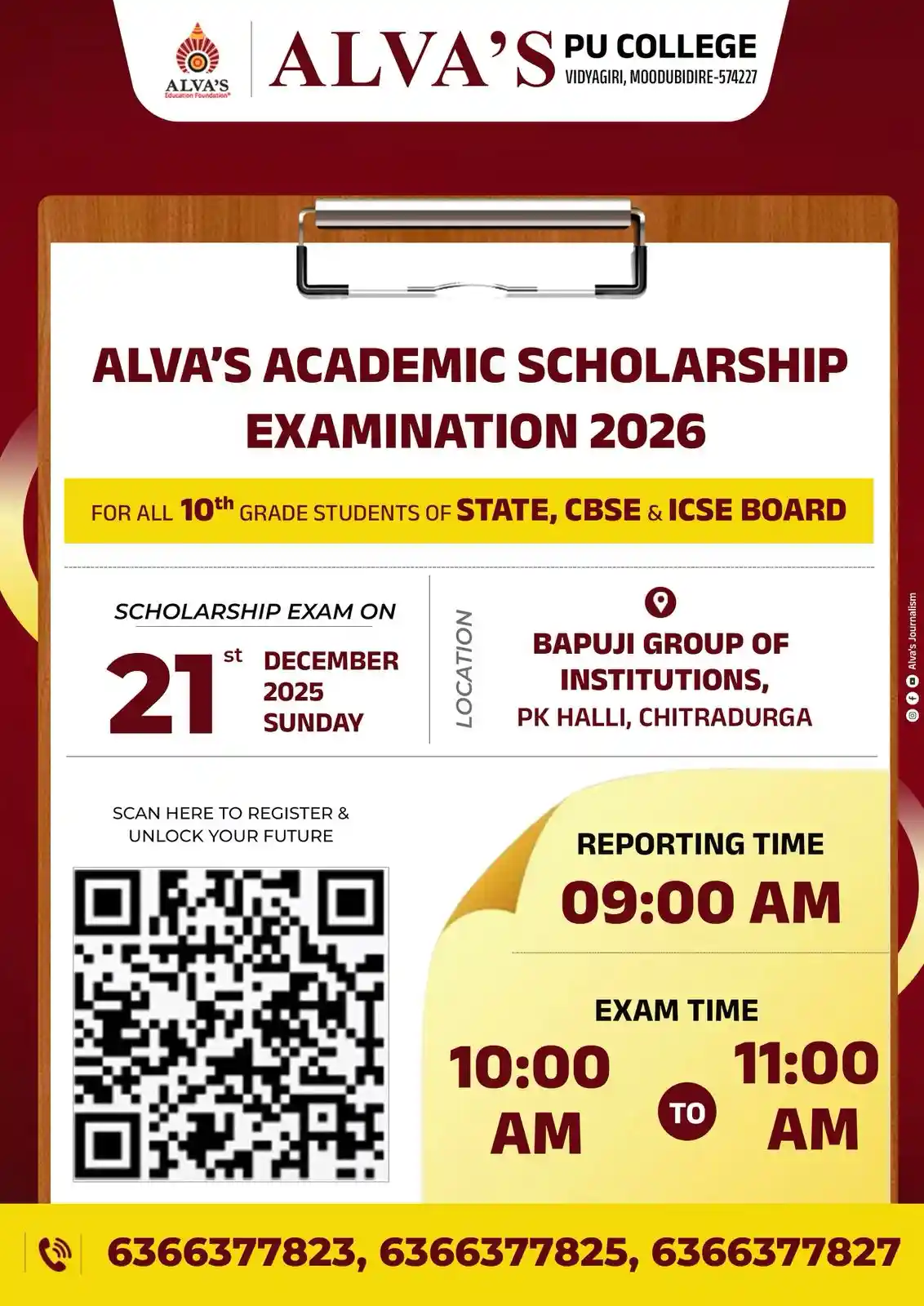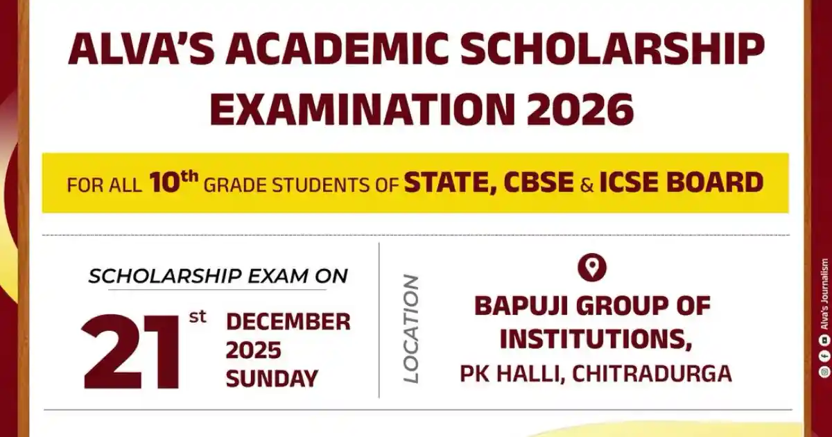ಮೂಡುಬಿದ್ರೆಯ ಆಳ್ವಾಸ್ ಪಿಯು ಕಾಲೇಜ್ ಪ್ರವೇಶಾತಿಗಾಗಿ ನಗರದ ಪಿಳ್ಳೆಕೆರೆನಹಳ್ಳಿಯ ಬಾಪೂಜಿ ಸಮೂಹ ವಿದ್ಯಾಸಂಸ್ಥೆಯಲ್ಲಿ ಪ್ರಸಕ್ತ ಸಾಲಿನ ಹತ್ತನೇ ತರಗತಿ ಓದುತ್ತಿರುವ ವಿದ್ಯಾರ್ಥಿ ವಿದ್ಯಾರ್ಥಿನಿಯರ ಉನ್ನತ ವ್ಯಾಸಂಗದ ಅನುಕೂಲಕ್ಕಾಗಿ ಆಳ್ವಾಸ್ ಅಕಾಡೆಮಿಕ್ ವಿದ್ಯಾರ್ಥಿ ವೇತನ ಪರೀಕ್ಷೆ ಆಯೋಜಿಸಲಾಗಿದೆ.