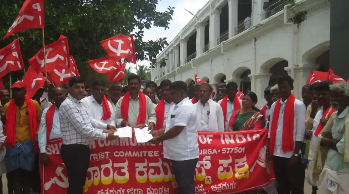 ಸುದ್ದಿಒನ್, ಚಿತ್ರದುರ್ಗ, ಜೂನ್.17 : ಮೊಳಕಾಲ್ಮುರು ತಾಲ್ಲೂಕಿನ ಫಾರಂ ನಂ. 57 ರ ಬಗರ್ ಹುಕುಂ ರೈತರಿಗೆ ಸಾಗುವಳಿ ಪತ್ರ ನೀಡುವಂತೆ ಒತ್ತಾಯಿಸಿ ಭಾರತ ಕಮ್ಯುನಿಸ್ಟ್ ಪಕ್ಷ ಜಿಲ್ಲಾ ಮಂಡಳಿಯಿಂದ ಜಿಲ್ಲಾಧಿಕಾರಿ ಕಚೇರಿ ಎದುರು ಮಂಗಳವಾರ ಪ್ರತಿಭಟನೆ ನಡೆಸಿ ಕಚೇರಿ ಸಹಾಯಕ ಹಾಗೂ ಅರಣ್ಯ ಇಲಾಖೆ ಎಸಿಎಫ್. ಮೂಲಕ ಅರಣ್ಯ ಸಚಿವರಿಗೆ ಮನವಿ ಸಲ್ಲಿಸಲಾಯಿತು.