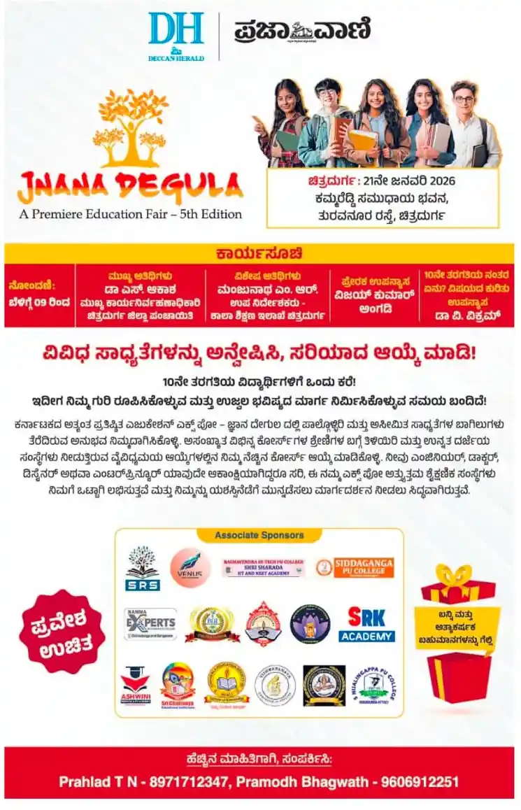 ಚಿತ್ರದುರ್ಗ, ಜನವರಿ. 20 : ಎಸ್ಎಸ್ಎಲ್ಸಿ ನಂತರ ಉನ್ನತ ಶಿಕ್ಷಣ ಪಡೆದು ಉಜ್ವಲ ಭವಿಷ್ಯ ರೂಪಿಸಿಕೊಳ್ಳಬೇಕು ಎಂದು ಹಂಬಲಿಸುತ್ತಿರುವ ವಿದ್ಯಾರ್ಥಿಗಳಿಗೆ ಸೂಕ್ತ ಮಾರ್ಗದರ್ಶನ ನೀಡುವ ಸಲುವಾಗಿ ‘ಪ್ರಜಾವಾಣಿ’ ಹಾಗೂ ‘ಡೆಕ್ಕನ್ ಹೆರಾಲ್ಡ್’ ಪತ್ರಿಕಾ ಸಮೂಹಸಂಸ್ಥೆಯು ನಗರದ ತುರುವನೂರು ರಸ್ತೆಯ ಕಮ್ಮರೆಡ್ಡಿ ಸಮುದಾಯ ಭವನದಲ್ಲಿ ಜನವರಿ 21ರಂದು ‘ಜ್ಞಾನ ದೇಗುಲ’ ಶೈಕ್ಷಣಿಕ ಮೇಳ ಹಮ್ಮಿಕೊಂಡಿದೆ.