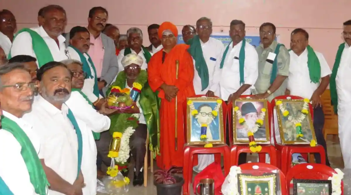 ಕೂಡಲ ಸಂಗಮ ಸುಕ್ಷೇತ್ರದ ಬಸವಪೀಠ 38 ನೇ ಶರಣ ಮೇಳ ಉತ್ಸವದಲ್ಲಿ ಒಕ್ಕಲಿಗ ಮುದ್ದಣ್ಣನವರ ನೆನಪಿನ ಪ್ರಮುಖ ಪ್ರಜೆ ರಾಷ್ಟ್ರೀಯ ಪ್ರಶಸ್ತಿ ಪಡೆದಿರುವ ರೈತ ಮುಖಂಡ ಹಿರಿಯ ಹೋರಾಟಗಾರ ಬೇಡರೆಡ್ಡಿಹಳ್ಳಿ ಬಸವರೆಡ್ಡಿಗೆ ಕರ್ನಾಟಕ ರಾಜ್ಯ ರೈತ ಸಂಘ ಹಾಗೂ ಹಸಿರುಸೇನೆ ಒಕ್ಕೂಟ, ಪ್ರಗತಿಪರ ಸಂಘಟನೆಗಳ ವತಿಯಿಂದ ಎ.ಪಿ.ಎಂ.ಸಿ. ರೈತ ಭವನದಲ್ಲಿ ಶುಕ್ರವಾರ ಹಮ್ಮಿಕೊಳ್ಳಲಾಗಿದ್ದ ಅಭಿನಂದನಾ ಸಮಾರಂಭದ ಸಾನಿಧ್ಯ ವಹಿಸಿ ಆಶೀರ್ವಚನ ನೀಡಿದರು.