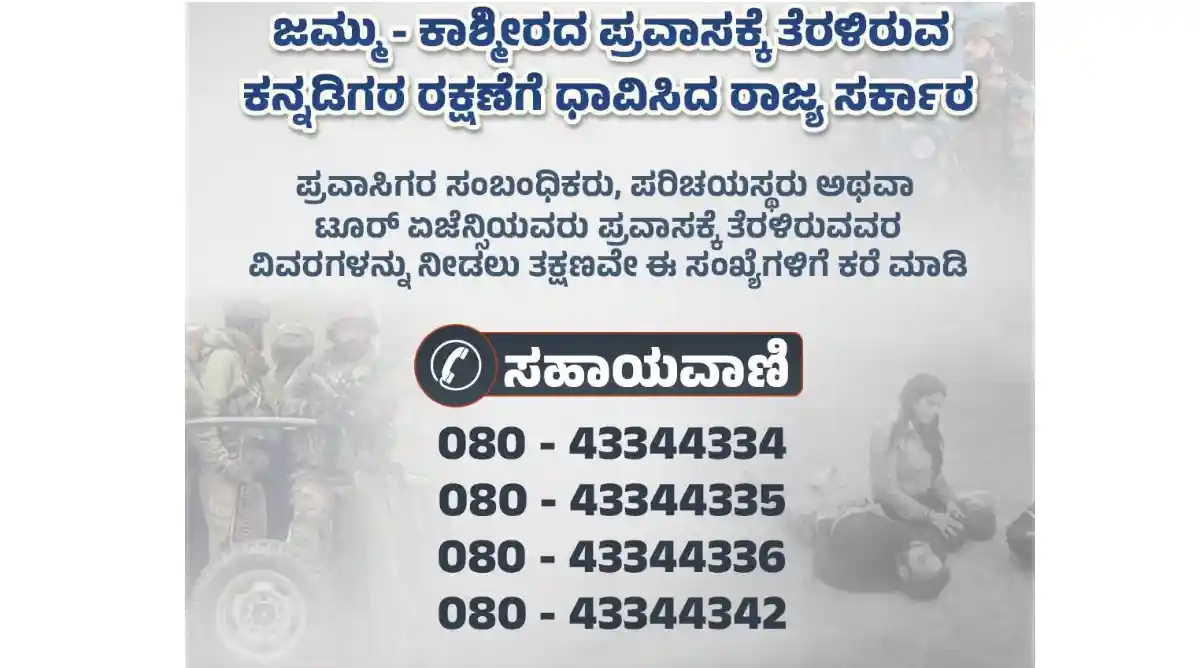 ಜಮ್ಮು-ಕಾಶ್ಮೀರಕ್ಕೆ ಪ್ರವಾಸಕ್ಕೆ ತೆರಳಿರುವ ಪ್ರವಾಸಿಗರ ಸಂಬಂಧಿಕರು ಅಥವಾ ಪರಿಚಯಸ್ಥರು ಪ್ರವಾಸಕ್ಕೆ ತೆರಳಿರುವವರ ವಿವರಗಳನ್ನು 080-43344334, 080-43344335, 080-43344336, 080-43344342 ಈ ಸಹಾಯವಾಣಿಗೆ ಮಾಹಿತಿ ನೀಡಬೇಕು ಎಂದು ಪ್ರವಾಸೋದ್ಯಮ ಇಲಾಖೆ ನಿರ್ದೇಶಕರು ಕೋರಿದ್ದಾರೆ.