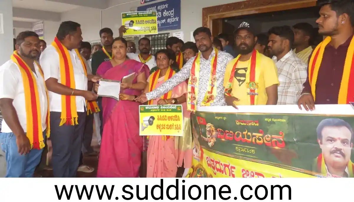ಸುದ್ದಿಒನ್, ಚಿತ್ರದುರ್ಗ, ಜುಲೈ. 08 : ನಗರದ ಜನನಿಬಿಡ ಪ್ರದೇಶಗಳಲ್ಲಿ ಸಿ.ಸಿ. ಕ್ಯಾಮರಾ ಅಳವಡಿಸುವಂತೆ ಕರುನಾಡ ವಿಜಯಸೇನೆ ವತಿಯಿಂದ ನಗರಸಭೆ ಎದುರು ಮಂಗಳವಾರ ಪ್ರತಿಭಟನೆ ನಡೆಸಿ ಪೌರಾಯುಕ್ತರಿಗೆ ಮನವಿ ಸಲ್ಲಿಸಲಾಯಿತು.
