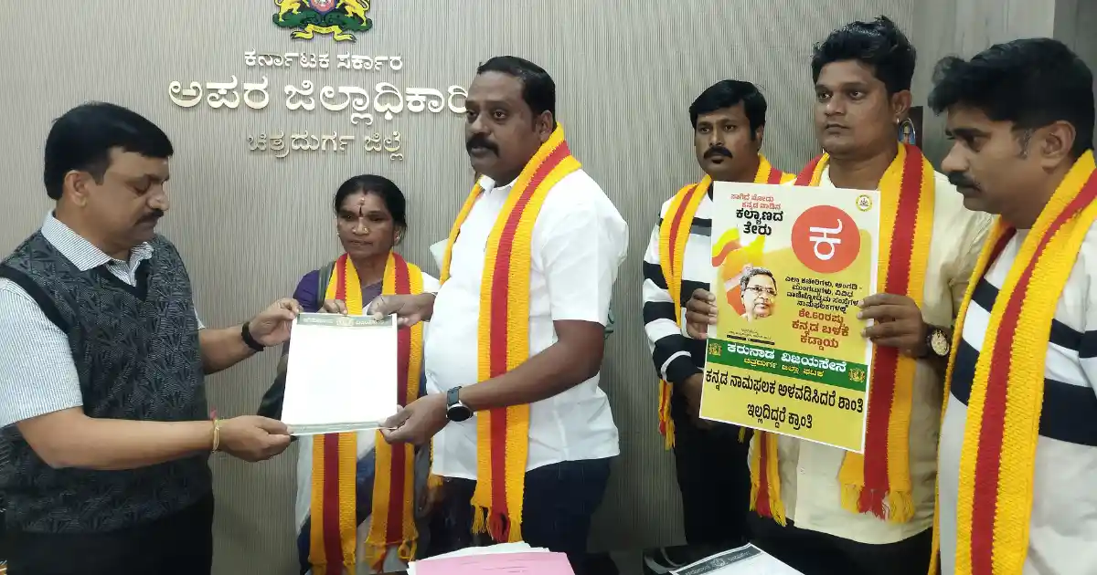 ಸುದ್ದಿಒನ್, ಚಿತ್ರದುರ್ಗ, ನವೆಂಬರ್. 30 : ಸರ್ಕಾರದ ಆದೇಶದಂತೆ ಶೇ.60 ರಷ್ಟು ಕನ್ನಡ ಕಡ್ಡಾಯ ನಾಮಫಲಕಗಳನ್ನು ಅಳವಡಿಸುವಂತೆ ಕರುನಾಡ ವಿಜಯಸೇನೆಯಿಂದ ಅಪರ ಜಿಲ್ಲಾಧಿಕಾರಿಗೆ ಶನಿವಾರ ಮನವಿ ಸಲ್ಲಿಸಲಾಯಿತು.