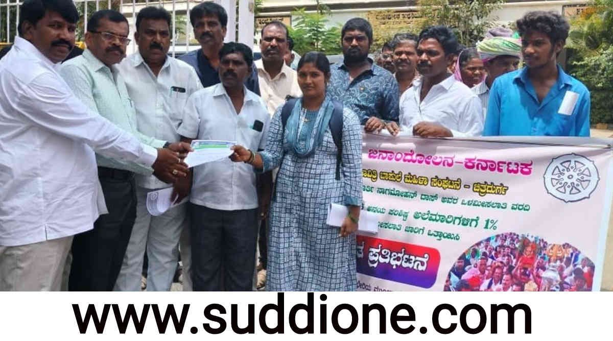 ಸುದ್ದಿಒನ್, ಚಿತ್ರದುರ್ಗ, ಆಗಸ್ಟ್. 25 : ಪರಿಶಿಷ್ಟರ ಪಟ್ಟಿಯಲ್ಲಿರುವ ಅಲೆಮಾರಿ ಜನಾಂಗದ 59 ಜಾತಿಗಳಿಗೆ ಪ್ರತ್ಯೇಕ ಶೇ. 1 ರಷ್ಟು ಮೀಸಲಾತಿಯನ್ನು ನೀಡುವಂತೆ ಸ್ಲಂ ಜನಾಂದೋಲನ-ಕರ್ನಾಟಕದಿಂದ ಜಿಲ್ಲಾಧಿಕಾರಿ ಕಚೇರಿ ಎದುರು ಸೋಮವಾರ ಪ್ರತಿಭಟನೆ ನಡೆಸಿ ಕಚೇರಿ ಸಹಾಯಕರ ಮೂಲಕ ರಾಜ್ಯದ ಮುಖ್ಯಮಂತ್ರಿ ಸಿದ್ದರಾಮಯ್ಯನವರಿಗೆ ಮನವಿ ಸಲ್ಲಿಸಲಾಯಿತು.