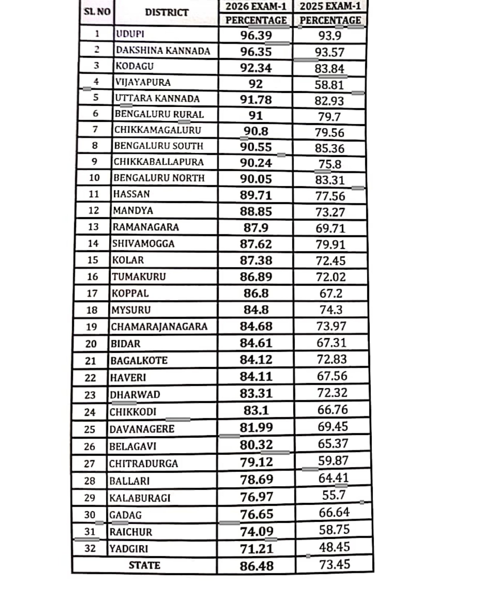 ಈ ಬಾರಿಯೂ ಸಹಜವಾಗಿಯೇ ಉಡುಪಿ ಪ್ರಥಮ ಸ್ಥಾನ ಪಡೆದಿದ್ದು, ಯಾದಗಿರಿ ಕೊನೆಯ ಸ್ಥಾನ ಪಡೆದುಕೊಂಡಿದೆ.