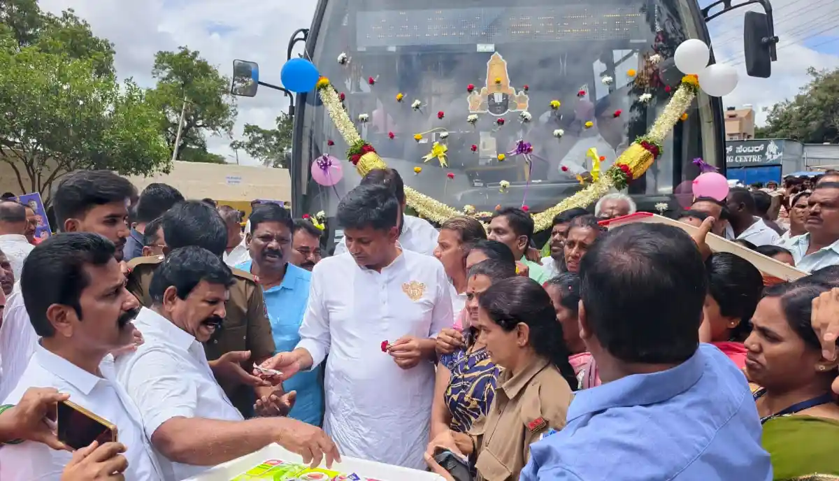 ಚಿತ್ರದುರ್ಗ ನಗರದ ಕೆಎಸ್ಆರ್ಟಿಸಿ ಬಸ್ ನಿಲ್ದಾಣದಲ್ಲಿ ಅಲಂಕೃತವಾಗಿರುವ ಬಸ್ಗೆ ಚಿತ್ರದುರ್ಗ ಶಾಸಕ ಕೆ.ಸಿ. ವೀರೇಂದ್ರ ಪಪ್ಪಿ ಹಾಗೂ ಜಿಲ್ಲಾ ಗ್ಯಾರಂಟಿ ಯೋಜನೆ ಅನುಷ್ಠಾನ ಪ್ರಾಧಿಕಾರದ ಅಧ್ಯಕ್ಷ ಆರ್.ಶಿವಣ್ಣ ಅವರು ಪೂಜೆ ನೆರವೇರಿಸಿ, ಮಹಿಳಾ ಪ್ರಯಾಣಿಕರಿಗೆ ಮತ್ತು ಸಾರಿಗೆ ಸಂಸ್ಥೆಯ ಸಿಬ್ಬಂದಿಗೆ ಹೂ ಹಾಗೂ ಸಿಹಿ ವಿತರಣೆ ಮಾಡಿದರು.