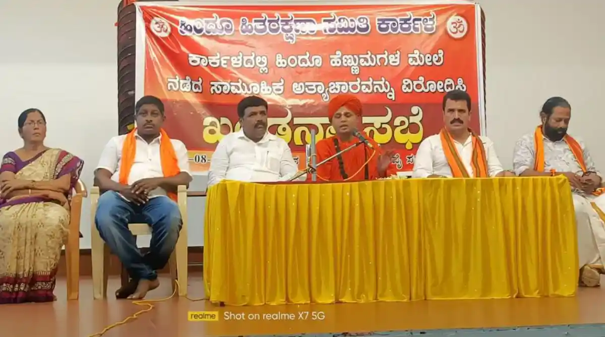 ಕಾರ್ಕಳದಲ್ಲಿ ಭೋವಿ ಸಮುದಾಯದ ಯುವತಿಯ ಮೇಲೆ ಅನ್ಯಕೋಮಿನ ದುರುಳರು ನಡೆಸಿದ ಅತ್ಯಾಚಾರ ಖಂಡಿಸಿ, ಕರ್ನಾಟಕ ಭೋವಿ ವಡ್ಡರ ಕ್ಷೇಮಾಭಿವೃದ್ಧಿ ಸಂಘ, ದ.ಕ ಮತ್ತು ಉಡುಪಿ, ಹಿಂದೂ ಹಿತರಕ್ಷಣಾ ಸಮಿತಿ ನೇತೃತ್ವದಲ್ಲಿ ವಿಶ್ವ ಹಿಂದೂ ಪರಿಷತ್, ಬಜರಂಗದಳ, ಹಿಂದೂ ಜಾಗರಣ ವೇದಿಕೆ ಸಹಯೋಗದಲ್ಲಿ ನಡೆದ ಖಂಡನಾ ಮೆರವಣಿಗೆಯ ಬಳಿಕ ಮಂಜುನಾಥ್ ಪೈ ಸಭಾಂಗಣದಲ್ಲಿ ನಡೆದ ಬೃಹತ್ ಸಭೆ ಉದ್ದೇಶಿಸಿ ಸ್ವಾಮೀಜಿ ಮಾತನಾಡಿದರು.